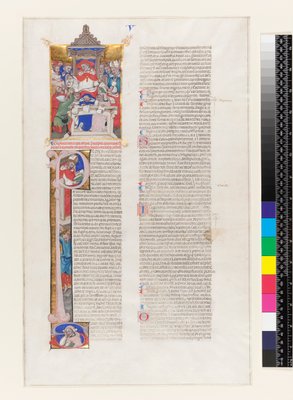 Pagina di testo con una lettera iniziale istoriata P e una miniatura raffigurante un cardinale in trono, dal Libro V delle Decretali di Gregorio IX, da Bologna, c.1350(Ms 331 fol.1r Page of text with an historiated initial P and a miniature depicting a cardinal enthroned, from Book V of the Decretals of Gregory IX, from Bologna, c.1350 )Italian School |