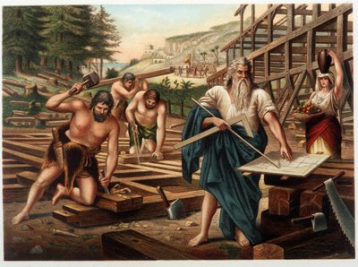Noè e la sua famiglia costruiscono l'arca (Noè guarda il piano di costruzione) in "Aurea Bibbia classica: storia della rivelazione divina nell'antico e nel nuovo testamento" di Giovanni Ladislao Sykora (vol. 1), tradotto da Don Clemente Benetti. (Bibbia it(Noe and his family building the ark (Noe looking at the plan of construction) in “” Aurea Bibbia classica: storia della rivelazione divina nell'antico e nel nouvo tesiamento””” by Giovanni Ladislao Sykora (vol 1), translated by Don Clemente Benetti (Italia)Italian School |