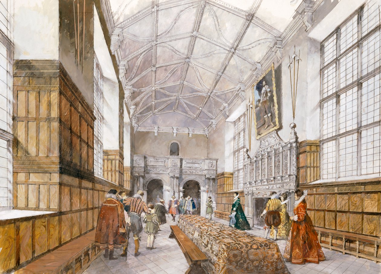 costruzione · costruzioni · femminile · donne · donna · la gente · maschio · bambino · bambini · interno · uomo · uomini · domestico · architettura · arti · paese · arte · uomo · britannico · inglese · colore · colore · prospettiva · posizione · soffitto · secolo · disegno · gran bretagna · tappezzerie · tappezzeria · signora · concetto · ventunesimo secolo · casa di paese · diciassettesimo secolo · vita domestica · sede stately · caratteristica architettonica · ricostruzione · rivestito · northamptonshire · storico · english heritage · queen elizabeth i · elizabeth i · queen elizabeth · elizabeth tudor · christopher · sir christopher · sir christopher hatton · hatton · christopher hatton · ivan lapper · lapper · ivan · prodigy house · Historic England/Heritage Images
