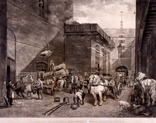 esterno · animale · strada · costruzione · costruzioni · la gente · maschio · uomo · uomini · animali · cavalli · cavallo · cane · commercio · magazzino · uomo · colore · colore · corsia · viale · carico · posizione · secolo · città di londra · capra · capre · sacco · barile · barili · fabbricazione della birra · fabbrica di birra · luppolo · luppoli · diciannovesimo secolo · diciannovesimo secolo · guildhall library art gallery · dean · aquatint · j bromley · dean wolstenholme · wolstenholme · bromley · j · London Metropolitan Archives (City of London)/Heritage Images