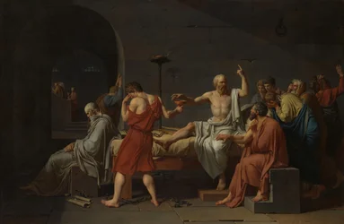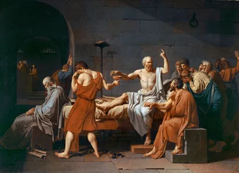 Socrate è una delle personalità più impressionanti della storia. Quando fu condannato a morte ad Atene per la sua influenza presumibilmente perniciosa sulla giovinezza e l'ateismo, gli fu data l'opportunità di proporre una frase alternativa. Quando dichiarò che al massimo una multa era appropriata, 80 dei 501 giurati cambiarono il loro voto e invece di 281, 361 votarono per l'esecuzione di Socrate attraverso la cicuta. Per rispetto della legge, Socrate non si rese conto della possibilità di fuga. David prende una serie di libertà storiche nella sua pittura: Socrate stesso è ritratto come più giovane e idealizzato, mentre Platone, seduto come un vecchio pensionato ai piedi, era a quel tempo un giovane e non presente all'esecuzione. Kriton si siede di fronte al divano, con la mano sulla coscia di Socrate.