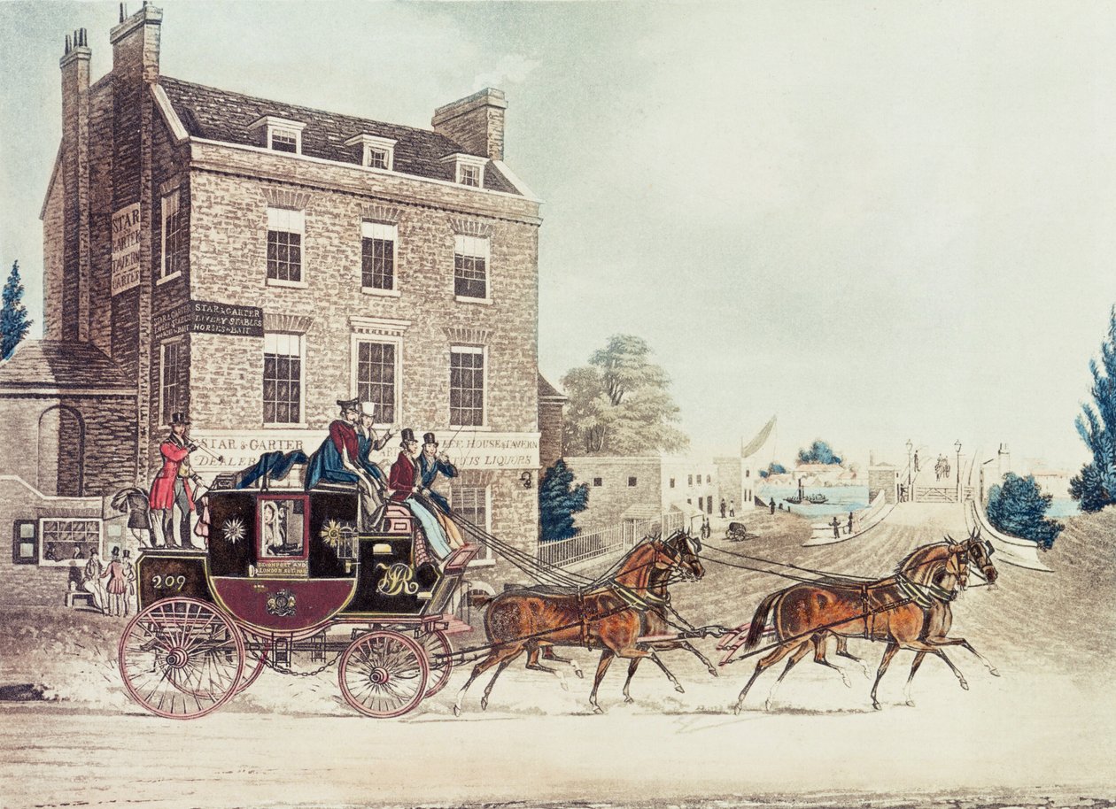 Quicksilver Royal Mail che passa lo Star and Garter al Kew Bridge, 1835(Quicksilver Royal Mail passing the Star and Garter at Kew Bridge, 1835 )James Pollard |