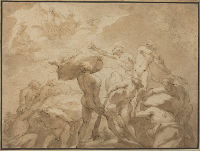 Battaglia degli dei e dei giganti dal Monte Olimpo e dal Monte Othrys (penna e inchiostro marrone con lavaggio marrone su carta vergata)(Battle of the Gods and Giants from Mount Olympus and Mount Othrys (pen and brown ink with brown wash on laid paper))Jan Luyken |
