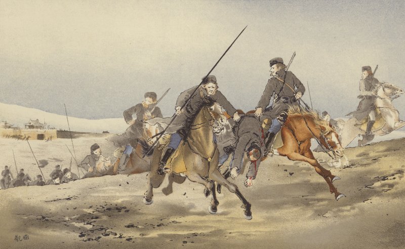 Cosacchi che scappano con un ferito(Cossacks running away with a Wounded (chromolitho))Japanese School |