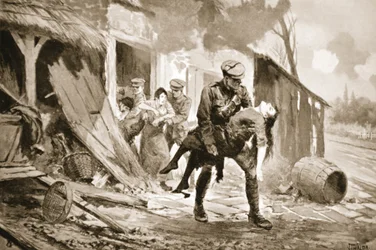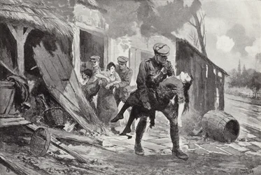Il soldato Rafferty porta in salvo una donna ferita da una fattoria sotto bombardamento (litografia)(Gunner Rafferty carrying a wounded woman to safety from a farmhouse which was being shelled (litho))John Harris Valda |