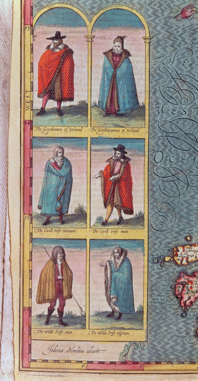 'Tipi' irlandesi, dettaglio da Il Regno d'Irlanda, inciso da Jodocus Hondius, dal 'Teatro dell'Impero di Gran Bretagna', pub. da John Sudbury e George Humble, 1610(Irish 'Types', detail from The Kingdom of Ireland, engraved by Jodocus Hondius (1563-1612), from the 'Theatre of the Empire of Great Britain', pub. by John Sudbury and George Humble, 1610 (coloured en)John Speed |