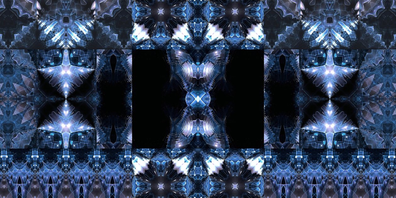 Fraktale blaue Energiezentral als feingliedrige leuchtende ornamentale Struktur in einer Collage.