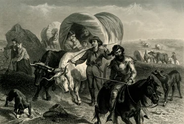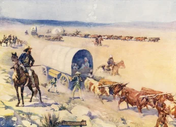 corsa · trasporto · trasporto · animale · la gente · maschio · lavoro · uomo · uomini · animali · la sudafrica · cavalli · cavallo · paese · giorno · uomo · occupazione · continente · viaggio · olandese · colore · colore · africano · migrazione · coltivatore · pianura · posizione · secolo · coloniale · professione · vagone · groppa · settler · diciannovesimo secolo · gli anni 20 · 1900s · ventesimo secolo · diciannovesimo secolo · boers · settlers · marshall · henrietta elizabeth · henrietta elizabeth marshall · j r skelton · thomas nelson and sons · he marshall · skelton · skelton · j r · joseph ratcliffe skelton · skelton · joseph ratcliffe · The Print Collector/Heritage Images
