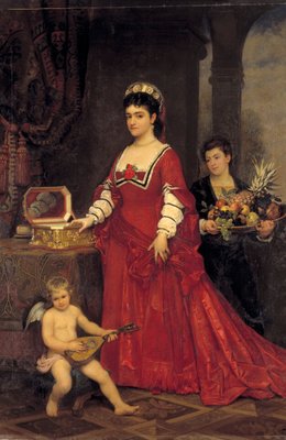 natura · germania · levarsi in piedi · italiano · femminile · donne · donna · la gente · interno · lavoro · rosso · ciotola · musica · frutta · tedesco · luminoso · pianta · piante · arti · paese · gioco · spettacolo · occupazione · colore · vestito · ananas · monili · gioielli · opera · posizione · secolo · strumento musicale · professione · cherubino · assistente · signora · alato · guardando macchina fotografica · servo · stringed lo strumento · cantante di opera · putto · colore · diciannovesimo secolo · diciannovesimo secolo · direct gaze · portrait · adelina · adelina patti · patti · playing an instrument · amorini · national museum of wales · ananas sativus · karl friedrich steinhardt · steinhardt · karl friedrich · adelina juana maria patti · ©National Museum of Wales/Heritage Images