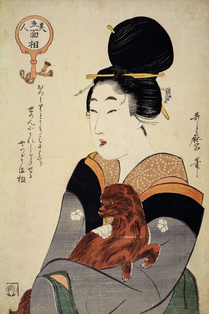 Donna che tiene un cane in braccio, da 'Cinque fisionomie della bellezza', c.1804(A woman holding a dog in her arms, from 'Five physiognomies of Beauty', c.1804 (colour woodblock print))Kitagawa Utamaro |