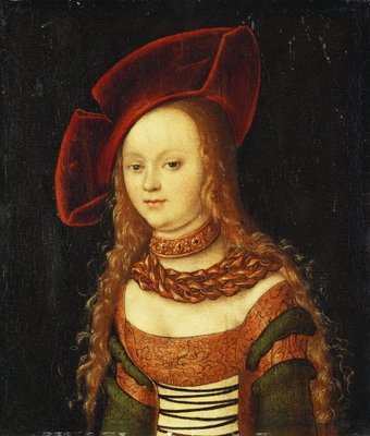 Ritratto di una giovane ragazza, mezzo busto, con un costume verde e oro e un cappello rosso(Portrait of a young girl, half length, wearing a green and gold costume with a red hat)Lucas Cranach |