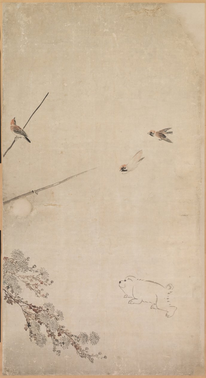 Cuccioli, Passeri e Crisantemi(Puppies, Sparrows and Chrysanthemums)Nagasawa Rosetsu |