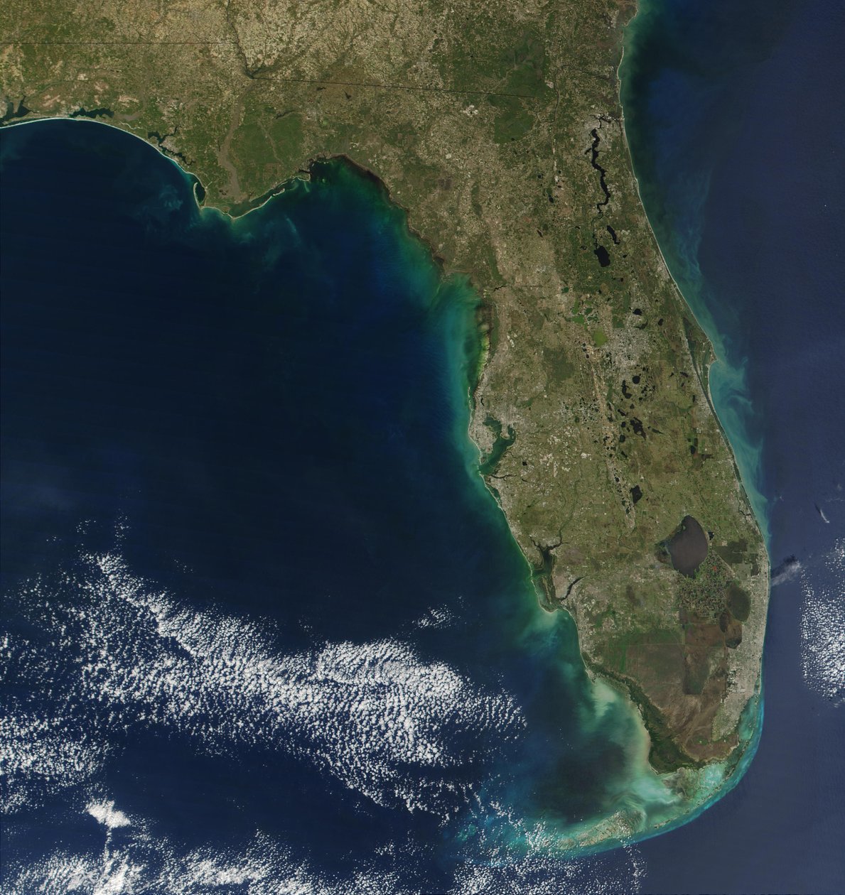 In questa immagine satellitare, fioritura dell'alga tossica Karenia brevis visibile lungo la costa occidentale della Florida(In this satellite image, bloom of the toxic alga Karenia brevis is visible along the west coast of Florida. (credit: Jacques Descloitres, NASA))National Aeronautics and Space Administration National Aeronautics and Space Administration |
