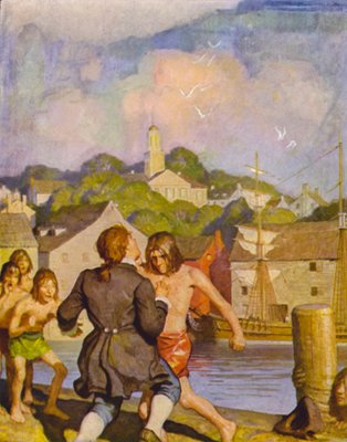 La lotta di Johnny con Cherry, da 'Drums' di James W. Boyd (1888-1944), pub. 1927(Johnny's Fight with Cherry, from 'Drums' by James W. Boyd (1888-1944), pub. 1927 (colour litho))Newell Convers Wyeth |