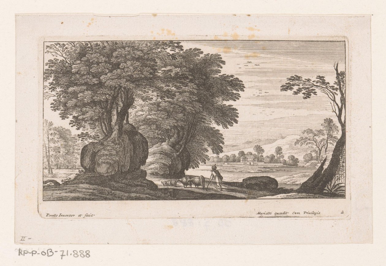 Paesaggio con figura e bestiame (serie)(Landschap met figuur en vee Landschappen (series title))Nicolas Perelle(print maker),Adam Perelle(print maker),Gabriel Perelle(print maker) |