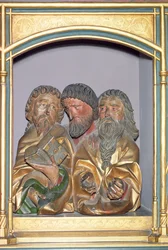 Intagli in legno di San Giacomo il Maggiore, San Simone e San Taddeo, dalla predella dell'Altare di Isenheim, c.1490(Wooden carvings of St. James the Greater, St. Simon and St. Thaddeus, from the predella of the Isenheim Altarpiece, c.1490 (painted wood))Nikolaus Hagenauer |