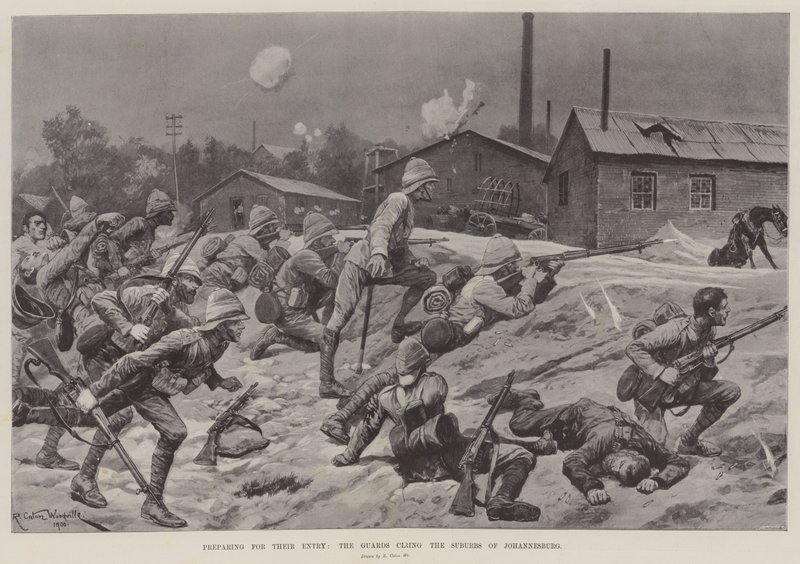 Preparativi per l'Ingresso, le Guardie che sgombrano i Sobborghi di Johannesburg(Preparing for their Entry, the Guards clearing the Suburbs of Johannesburg )Richard Caton Woodville junior |