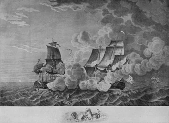 trasporto · trasporto · mare · le indie ad ovest · le indie · caraibico · paese · francese · francia · nave · navi · britannico · geografia · combattimento · guerra · posizione · secolo · gran bretagna · concetto · battaglia · georgiano · marina militare · sparare · monocromo · guerra · navigazione della nave · atlante · guerra navale · nave da guerra · nero bianco · nero e bianco · diciottesimo secolo · diciottesimo secolo · outnumbered · engraving · richard paton · paton · richard · aigrette · florissant · hms buckingham · The Print Collector/Heritage Images