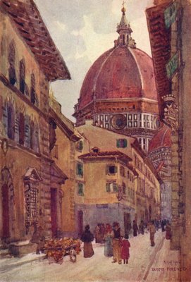 levarsi in piedi · strada · la gente · maschio · bambino · bambini · lavoro · uomo · uomini · religioso · architettura · la toscana · paese · religione · giorno · uomo · occupazione · rivista · cattedrale · chiesa · colore · colore · corsia · viale · cristianesimo · firenze · prospettiva · posizione · secolo · duomo · professione · venditore di via · carrello della mano · 1900s · ventesimo secolo · the connoisseur · watercolour · via dei servi · robert charles goff · goff · robert charles · The Print Collector/Heritage Images