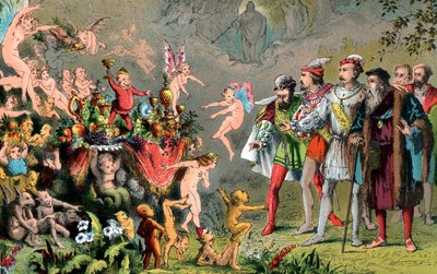 Alonso parla ne La Tempesta, Atto III, Scena III, "Cieli, che cosa erano questi", da "The Illustrated Library Shakespeare", pubblicato a Londra nel 1890 (litografia a colori)(Alonso speaks in The Tempest, Act III, Scene III, 'Heavens, what were these', from 'The Illustrated Library Shakespeare', published London 1890 (colour litho))Robert Dudley |