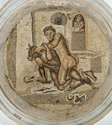 Teseo lotta con il Minotauro nel Labirinto(Theseus wrestling with the Minotaur in the Labyrinth (mosaic))Roman Imperial Period |