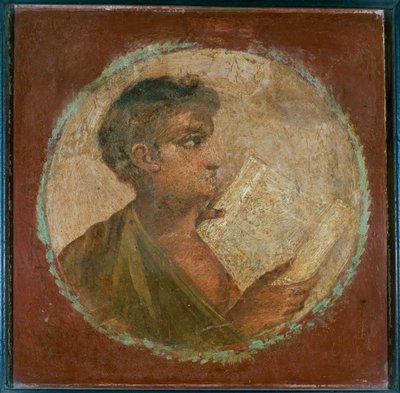 Ritratto di un giovane che tiene un rotolo di papiro, 55-79 d.C. (affresco)(Portrait of a young man holding a papyrus scroll, 55-79 AD (fresco))Roman |