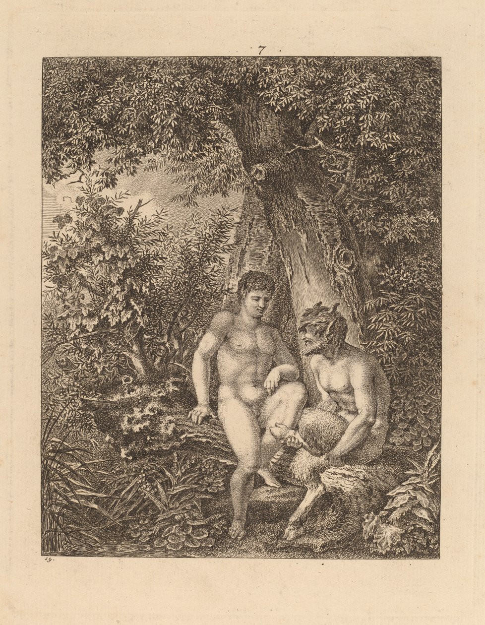 natura · foresta · legno · terreno boscoso · albero · legno · la gente · maschio · uomo · uomini · pianta · piante · arti · paese · la svizzera · nudo · nudo · arte · uomo · washington · svizzero · posizione · secolo · galleria · zoccolo · stampa · mitologia · nudità · galleria d'arte · nudità · nero bianco · nero e bianco · zoccoli · faun · galleria nazionale di arte · diciottesimo secolo · diciottesimo secolo · fauns · satyr · satyrs · alberi · art centre · hooved · heritage art · print · etching on laid paper · salomon gessner · gessner · salomon · s gesner · salomon gesner · Heritage Art/Heritage Images