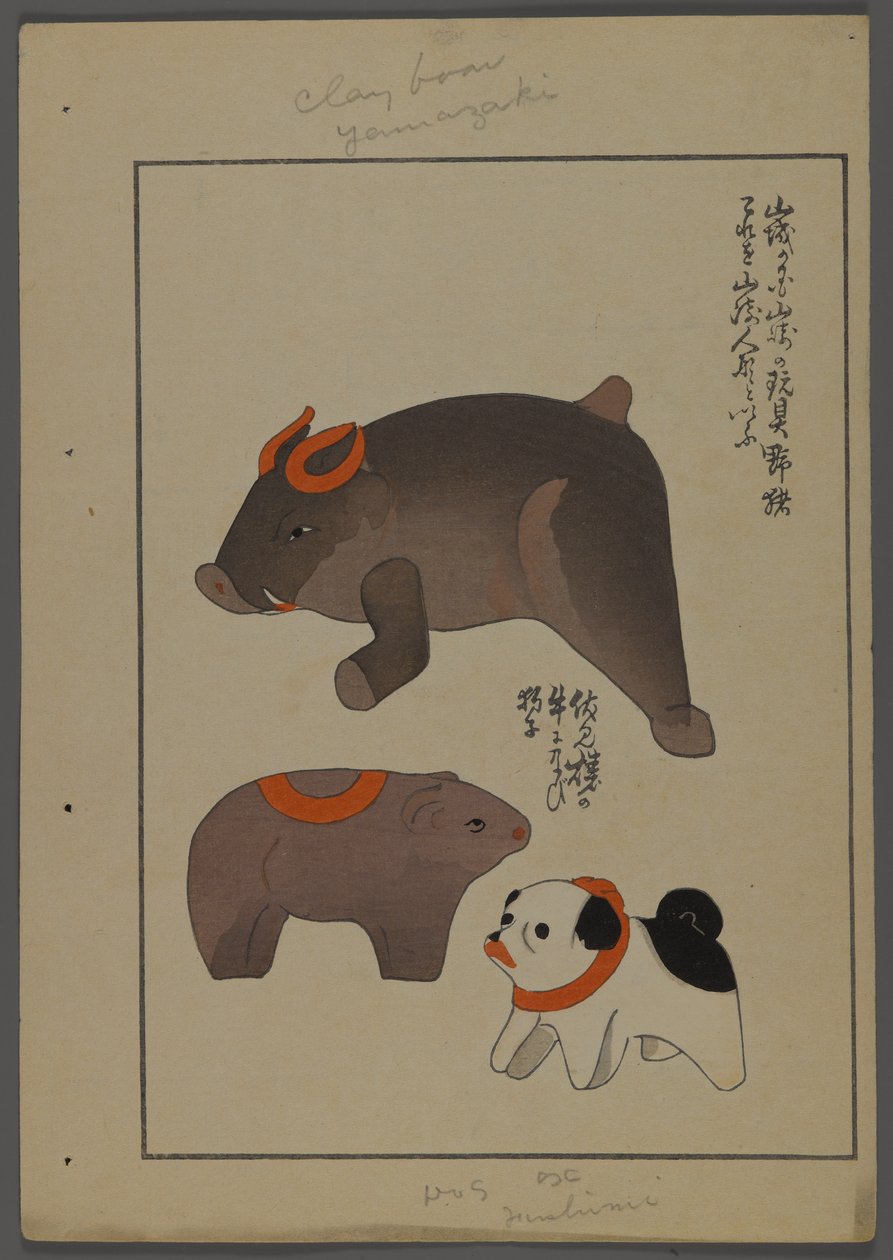 Giochi giapponesi, da Unai no tomo (Gli amici di un bambino) di Shimizu Seifu, 1891-1923. Cane, cinghiale, orso.(Japanese toys, from Unai no tomo (A Childs Friends) by Shimizu Seifu, 1891-1923. Dog, boar, bear.)Shimizu Seifu |
