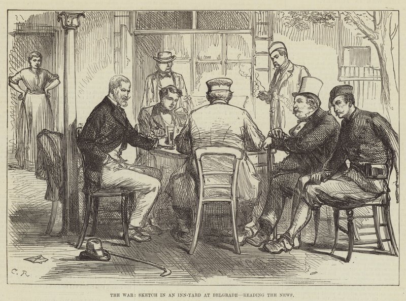 La guerra, schizzo in un cortile di una locanda a Belgrado, leggendo le notizie(The War, Sketch in an Inn-Yard at Belgrade, reading the News )Sir John Charles Robinson |