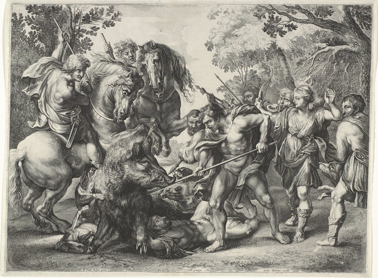 Caccia al cinghiale calidonio(Jacht op het Calydonische zwijn)Théodorus van Kessel(print maker),Peter Paul Rubens(after painting by),Jacques Moermans(publisher) |
