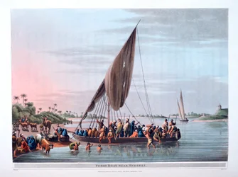 trasporto · trasporto · fiume · cielo · animale · acqua · la gente · maschio · uomo · uomini · attesa · barca · barche · paese · incrocio · bestiame bovino · giorno · uomo · albero · geografia · affollato · traghetto · carico · posizione · secolo · scarico · vela · concetto · gruppo di persone · arabo · diciannovesimo secolo · diciannovesimo secolo · art media · nedssili · aquatint · luigi · thomas milton · luigi mayer · mayer · milton · thomas · Art Media/Heritage Images
