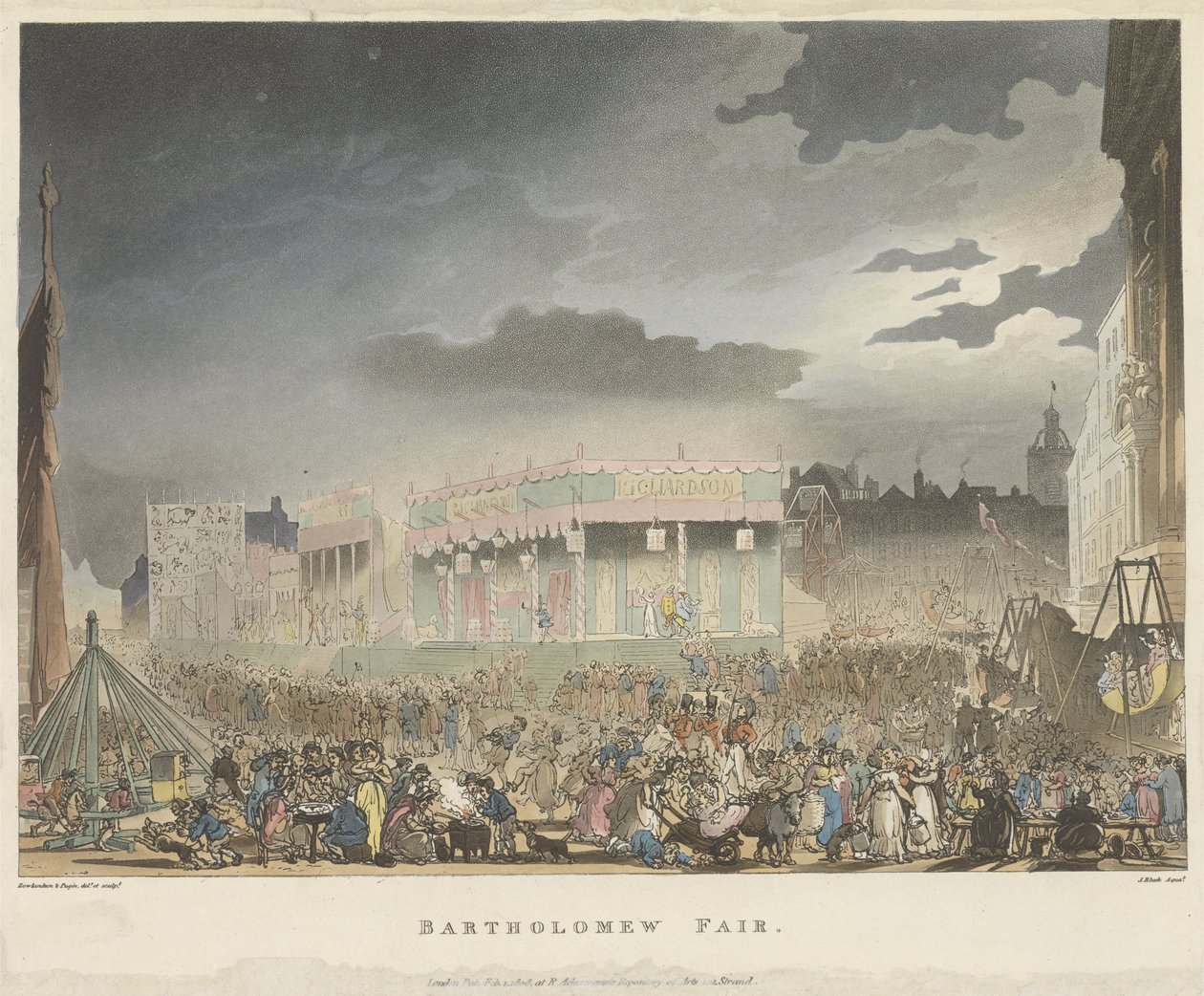 Fiera di San Bartolomeo, da Microcosm of London, or London in Miniature, Vol. I, di Rudolph Ackerman, inciso da J. Bluch(Bartholomew Fair, from the Microcosm of London, or London in Miniature, Vol. I, by Rudolph Ackerman, engraved by J. Bluch )Thomas after Rowlandson |