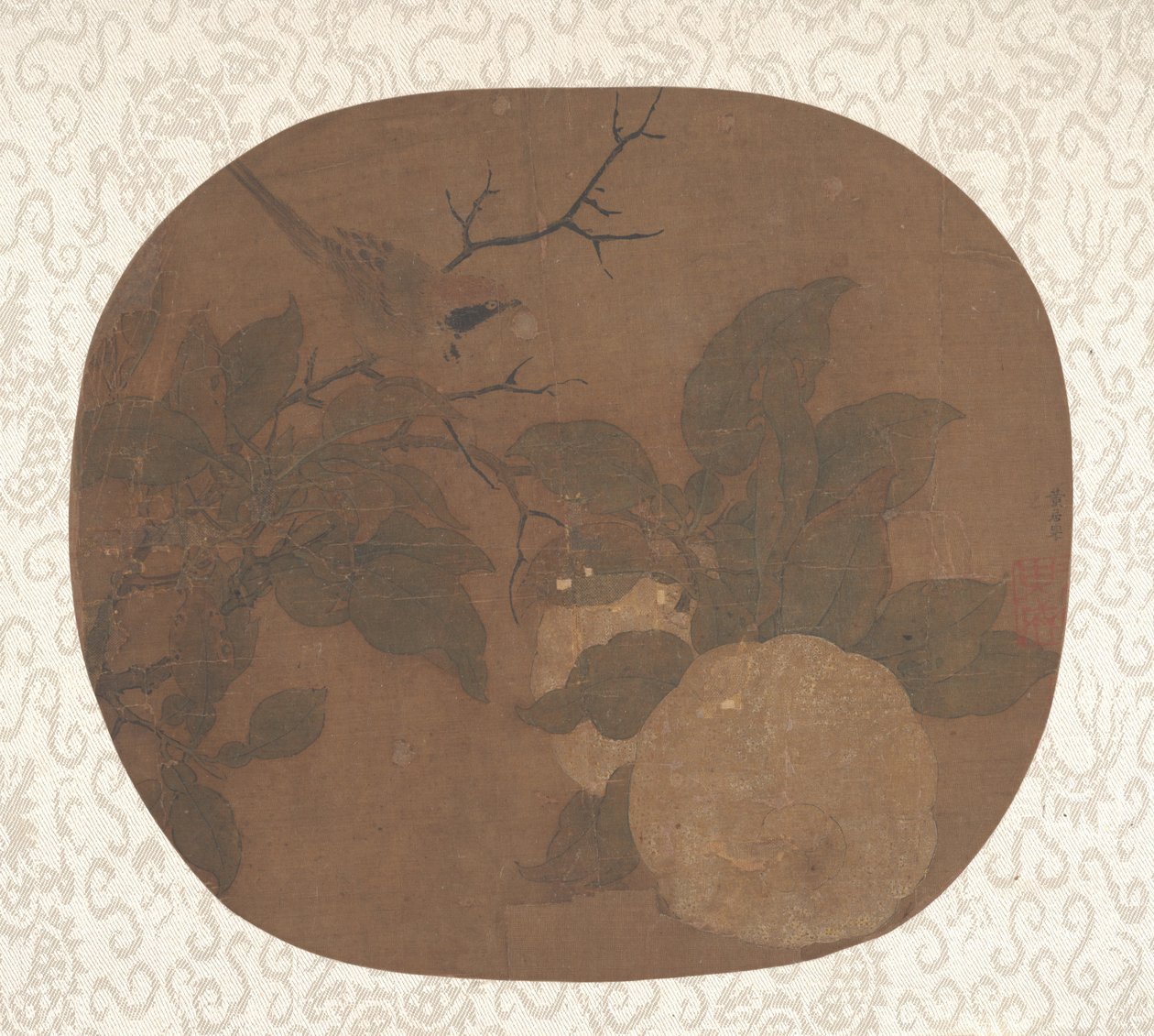 natura · animale · albero · fiore · fiori · pianta · piante · arti · uccello · uccelli · paese · ramo · cina · arte · cinese · museo · colore · posizione · secolo · dinastia · camelia · colore · venuto a contatto di · museo metropolitano d'arte · il museo metropolitano di arte · decimi secolo · decimo secolo · alberi · unknown · heritage art · ink and color on silk · ink and color on silk · fan mounted as an album leaf · fan mounted as an album leaf · Heritage Art/Heritage Images