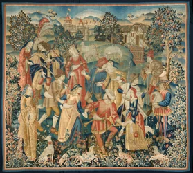 tempo libero · femminile · donne · donna · la gente · maschio · gruppo · uomo · uomini · rosso · musica · arti · ballo · paese · francese · francia · musicista · arte · verde · uomo · danza · ballerino · colore · cacciare · washington · decorazione · decorativo · scena · villaggio · rustic · socialising · cornamusa · posizione · secolo · divertimento · comunità · strumento musicale · strumenti musicali · galleria · pastoral · divertimento · tessuto · tappezzerie · tappezzeria · seta · concetto · lane · galleria d'arte · bagpiper · arti decorative · colore · galleria nazionale di arte · sedicesimo secolo · sedicesimo secolo · rurale · unknown · silk · regionalism · art centre · heritage art · bagpipe player · wool warp and weft with silk highlights in weft · decorative art · Heritage Art/Heritage Images