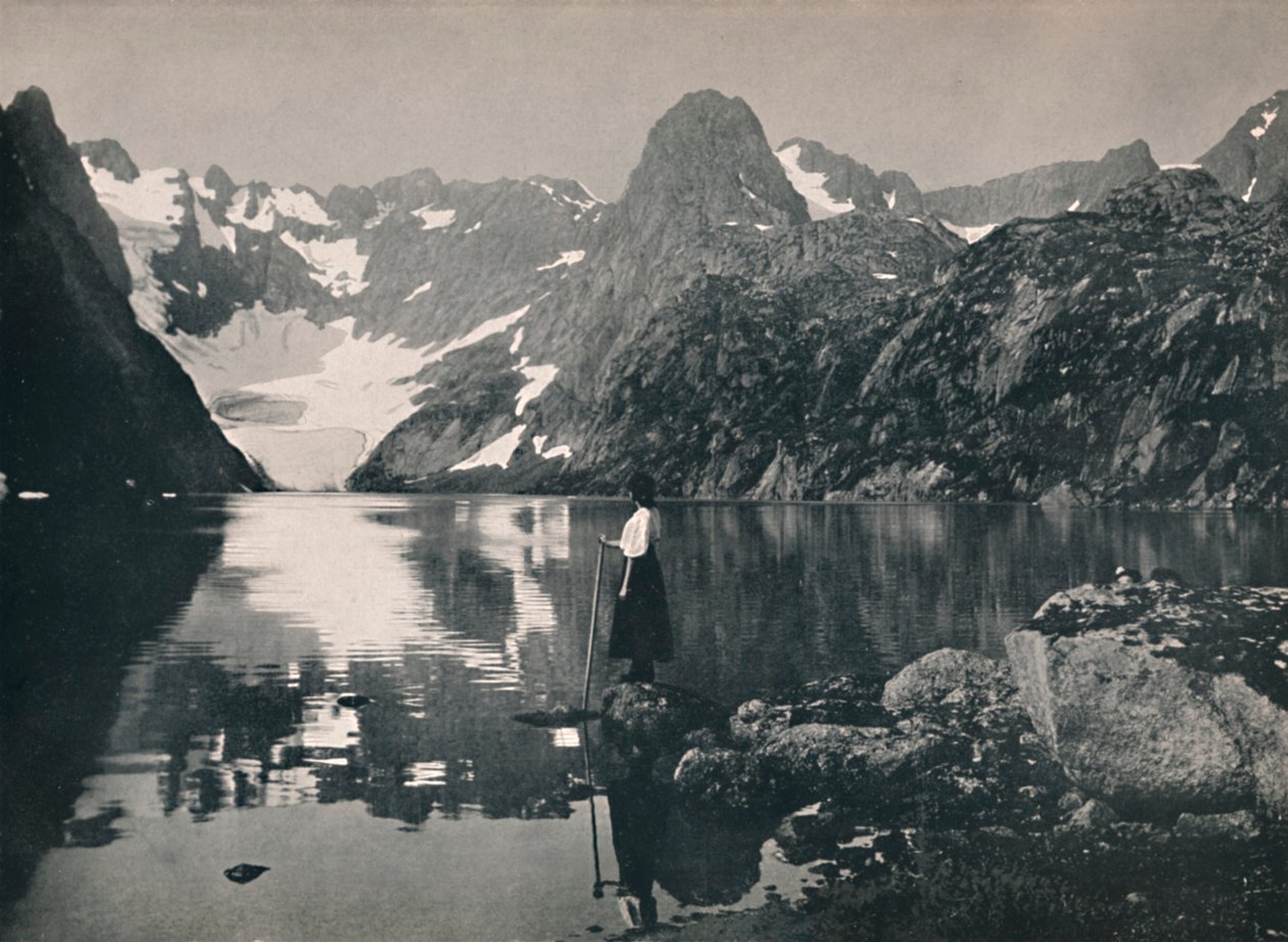 corsa · esterno · europa · scenico · levarsi in piedi · acqua · femminile · donne · donna · la gente · guardare · arti · montagna · montagne · paese · puntello · riflessione · lago · a distanza · ancora · libro · norvegia · norvegese · vista · geografia · lakeside · paesaggio · posizione · secolo · vista · annata · personale · solo · letteratura · signora · concetto · riflesso · una persona · attrazione turistica · snowcapped · neve-ricoperto · monocromo · giorno · nero bianco · nero e bianco · gli anni 10 · ventesimo secolo · turismo · photograph · landscape · unknown · walking staff · norge turistruter · mittet co · mittet · trold · The Print Collector/Heritage Images |