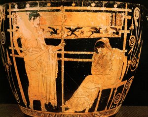 Cratere a calice a figure rosse e bianche: dettaglio raffigurante scena di banchetto(Red and white figure calyx crater: detail depicting banquet scene, Greek (pottery) (detail of 85012))Unbekannt |