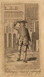 Giovane gentiluomo che cammina e saluta i passanti per strada(Young gentleman walking and saluting passerby on the street)Unbekannt |