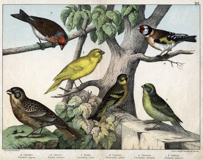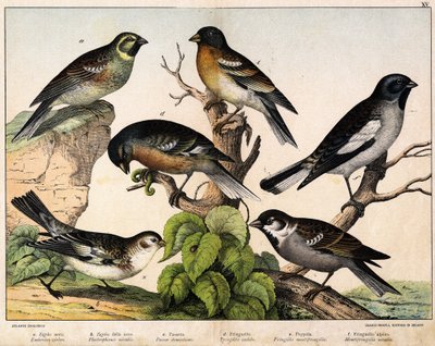 Passeriformi, Fringuelli Varie specie di tordo (Turdus) Uccelli, c.1860 a: Usignolo (Luscinia vera), b: Pettazzurro (Cyanecula suecica), c: Capinera (Sylvia atricapilla), d: Sterpazzola (Sylvia ciciera), e: Beccafico (Sylvia salicaria), f: Bigiarella (Sylvia curruca), g: Canapino (Hypolais icterina) - in Varie specie di fringuelli (Fringilla) I 5 uccelli di sinistra - a: Rondine (Parus major), b: Occhi blu (Parus coreulus), c: Capelli neri (Parus ater), d: Occhi neri (Lopophanes cristatus), e: Occhi neri (Parus palustris) I 4 uccelli di destra - a: Rondine rustica (Hirondo rustica), b: Rondine Uccelli Diverses illustration of birds "Storia" degli uccelli naturali". ed. Hoepli, Milano Passere (Emberiza) Illustrazione per "Storia naturale degli uccelli", ed. Hoepli, Milano Vari uccelli, c.1900 (incisione) Uccelli a: Tordo (Turdus viscivorus), b: Tordo (Turdus pilaris), c: Merlo (Merula torquata), d: Merlo azzurro (Monticola cyanus), e: Merlo (Merula nigra), f: Beccofrusone (Ampelis garulus) - in a: Averla grigia (Lanius excubitor), b: Averla del nord (Lanius collurio), c: Averla dal petto rosa (Lanius linor), d: Ara rossa (Ara macao), e: Pappagallo di Alessandria (Palaeornis Alexandria), f: Cacatua di Banks (Calyptorynchus banksii) - in Passeriformi, fringuelli a: Pappagallo grigio (Psittacus erithacus), b: Pappagallo cacatua (Cacatua galerita), c: Tucano (Ramphastos temminckii), d: Picchio nero (Picus Martius), e: Picchio verde (Gecinus veridis), f: Picchio rosso maggiore (Dendrocopus minor) - "Storia Naturale d a: Cornacchia grigia (Corvus cornix), b: Taccola (Corvus monedula), c: Ghiandaia (Garrulus glandarius), d: Nocciolaia (Nucifraga caryocatactes), e: Gracchio alpino (Pyrrohocorax alpinus), f: Gracchio corallino (Pyrrhocorax pyrrhocorax) - in Parus: Cinciallegre e Paridi Uccelli Passeriformi, Fringuelli Passero domestico, 1864 Sturnus e Tanagra (Storni e Tanagers) a: Allodola del nord (Alauda arvensis), b: Allodola lulu (Lullula arborea), c: Cappellaccia (Galerita cristata), d: Storno sansonetto (Sturnus vulgaris), e: Merlo acquaiolo (Cinclus aquaticus), f: Tordo (Turdus musicus) - in "Storia naturale degli uccelli" Uccelli Uccelli canori: usignolo, uccello rosso, merlo e tordo Uccelli Gazze e ghiandaie