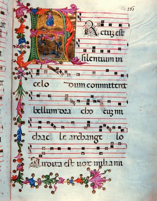 Antifonario in nota 5, libro che contiene i canti che il coro deve intonare durante la messa (pergamena).(Antiphonary in note 5, a book which contains the chants to be sung by the choir during mass (parchment))Unknown Artist |