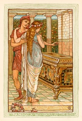Pandora si meraviglia della scatola, illustrazione da 'A Wonder-Book for Girls and Boys' di Nathanial Hawthorne, 1852(Pandora wonders at the box, illustration from 'A Wonder-Book for Girls and Boys' by Nathanial Hawthorne, 1852 )Walter Crane |