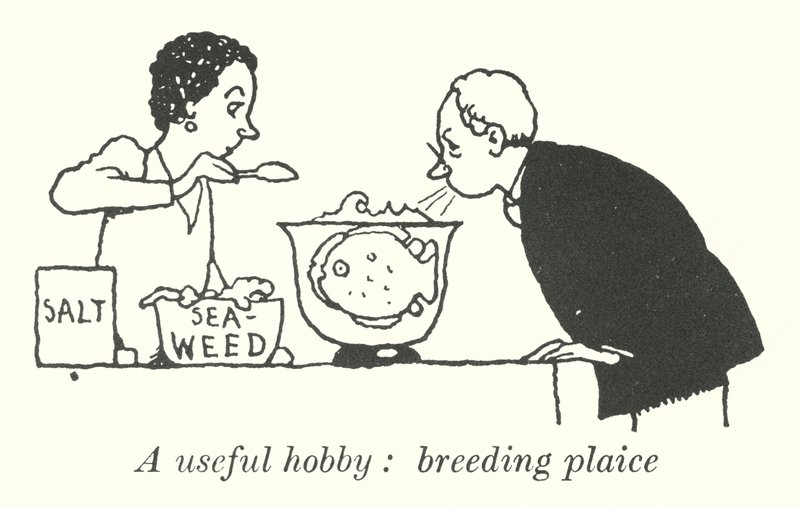 Un hobby utile, allevare sogliole(A useful hobby, breeding plaice (litho))William Heath Robinson |