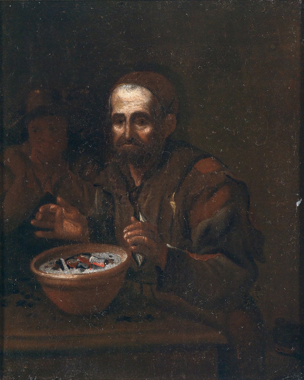 Un vecchio che si riscalda al fuoco di carbone(Ein alter sich an einem Kohlefeuer wärmender Mann)Workshop of Michiel Sweerts |